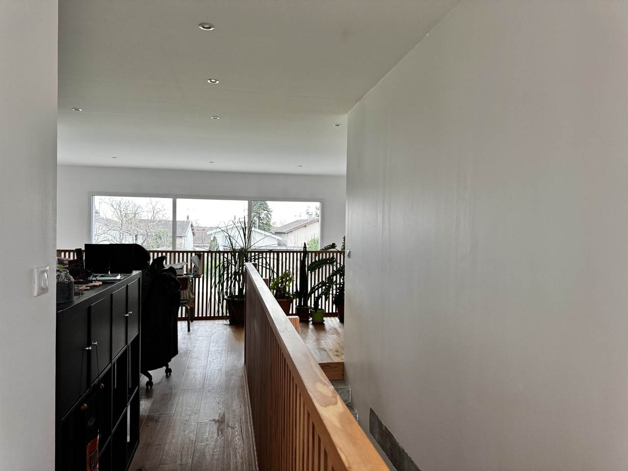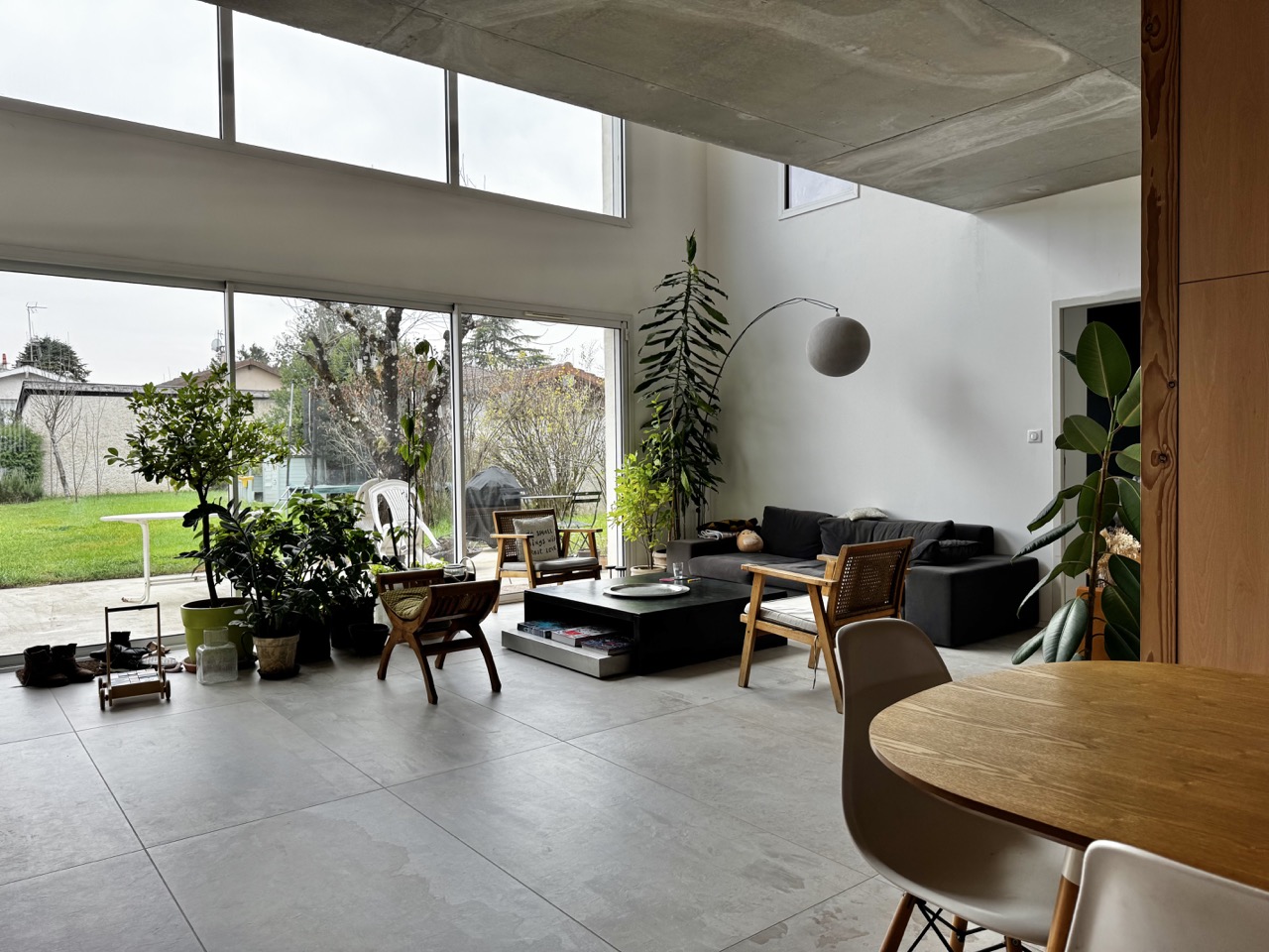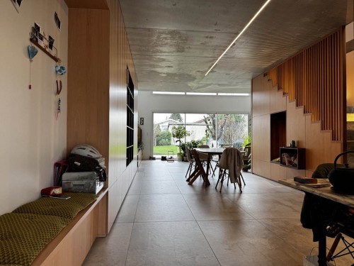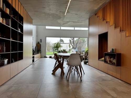 Maison d'architecte en béton étirée sur une parcelle étroite au centre du village, le placage en bois et la façade sud vitrée éclairent et réchauffe le coté brut du béton. À l'étage 3 des 4 chambres, 1 bureau, et petite terrasse.