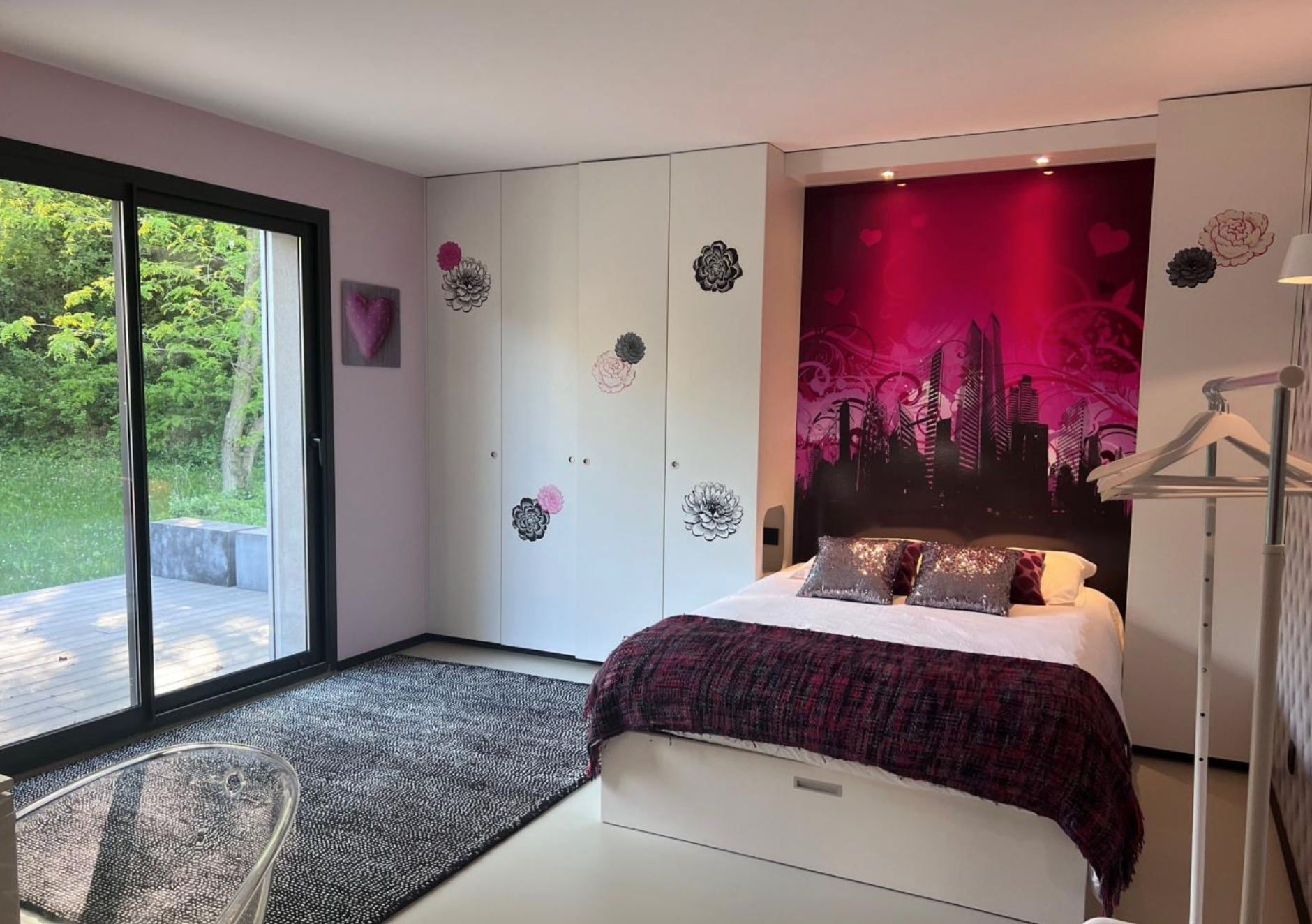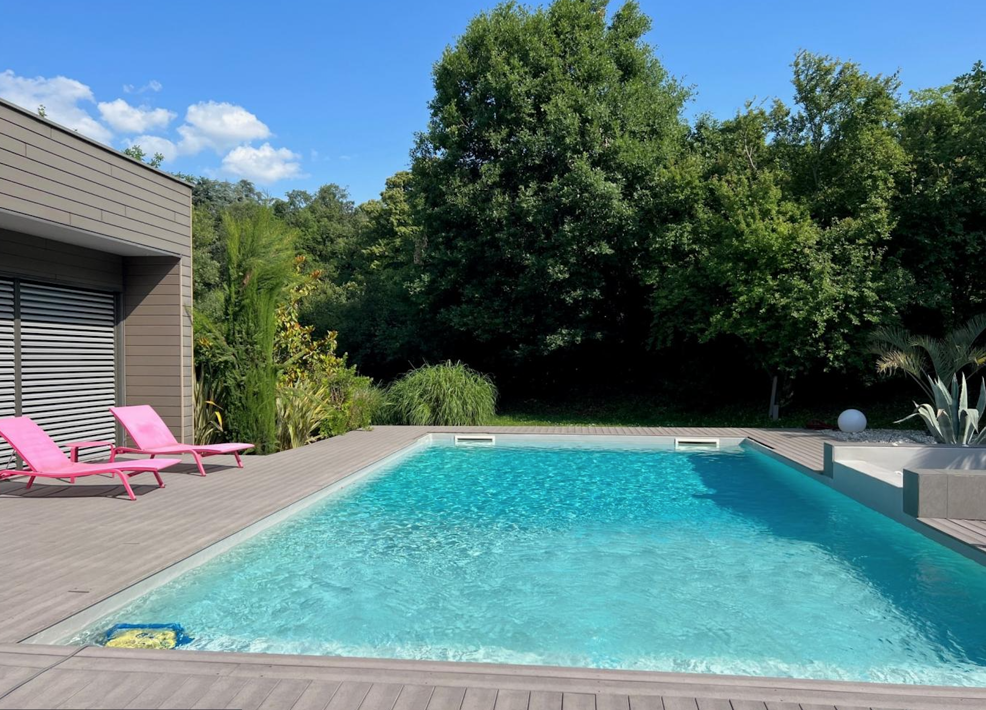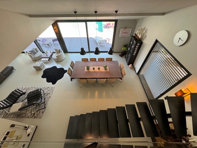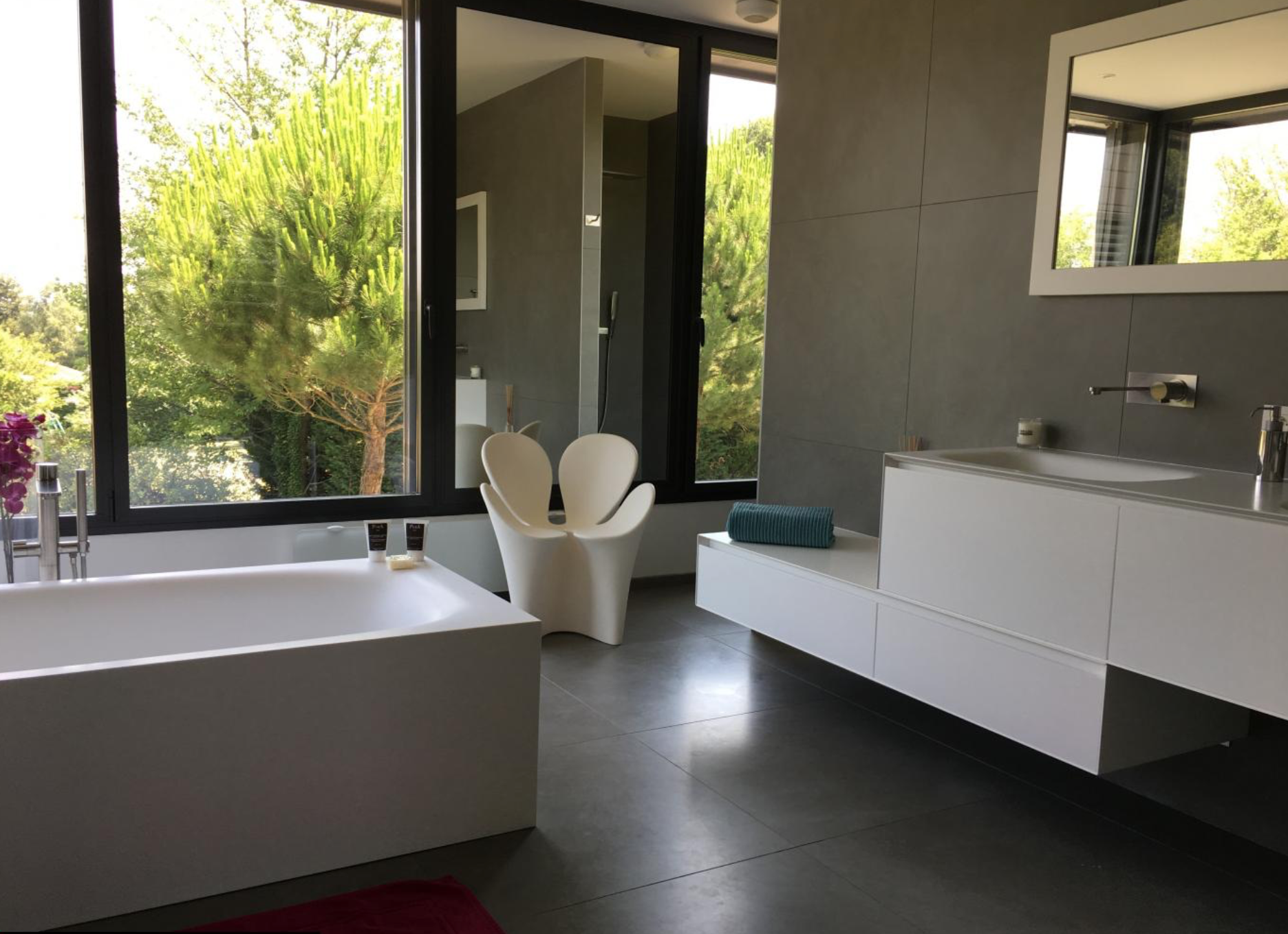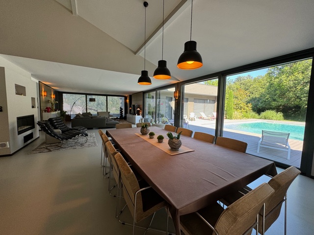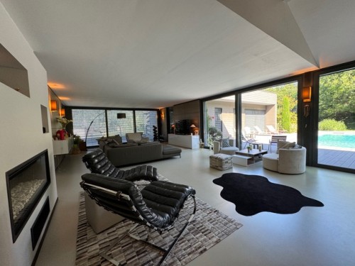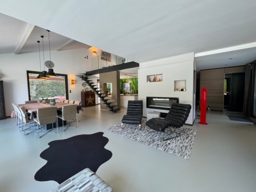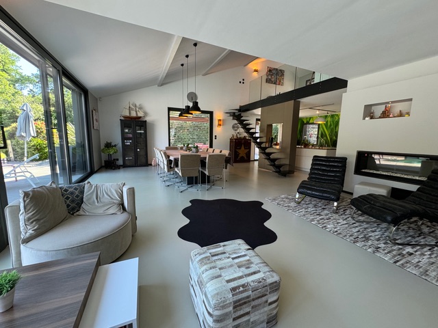 En intérieur grand volume de l'espace living avec sol en béton, cheminée, escalier design en acier et domotique. En extérieur piscine, terrasse et jardin soignée.