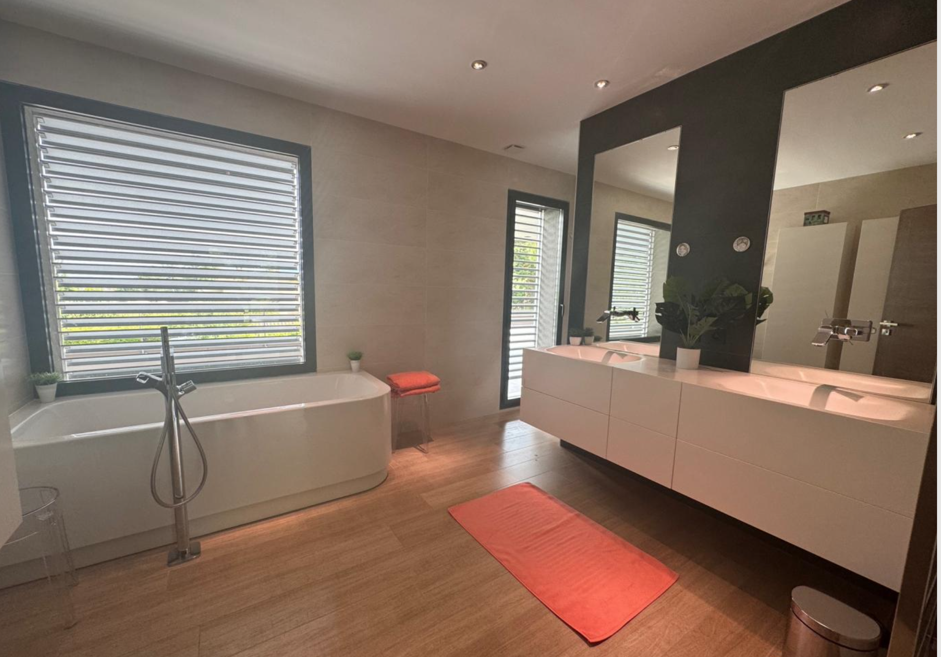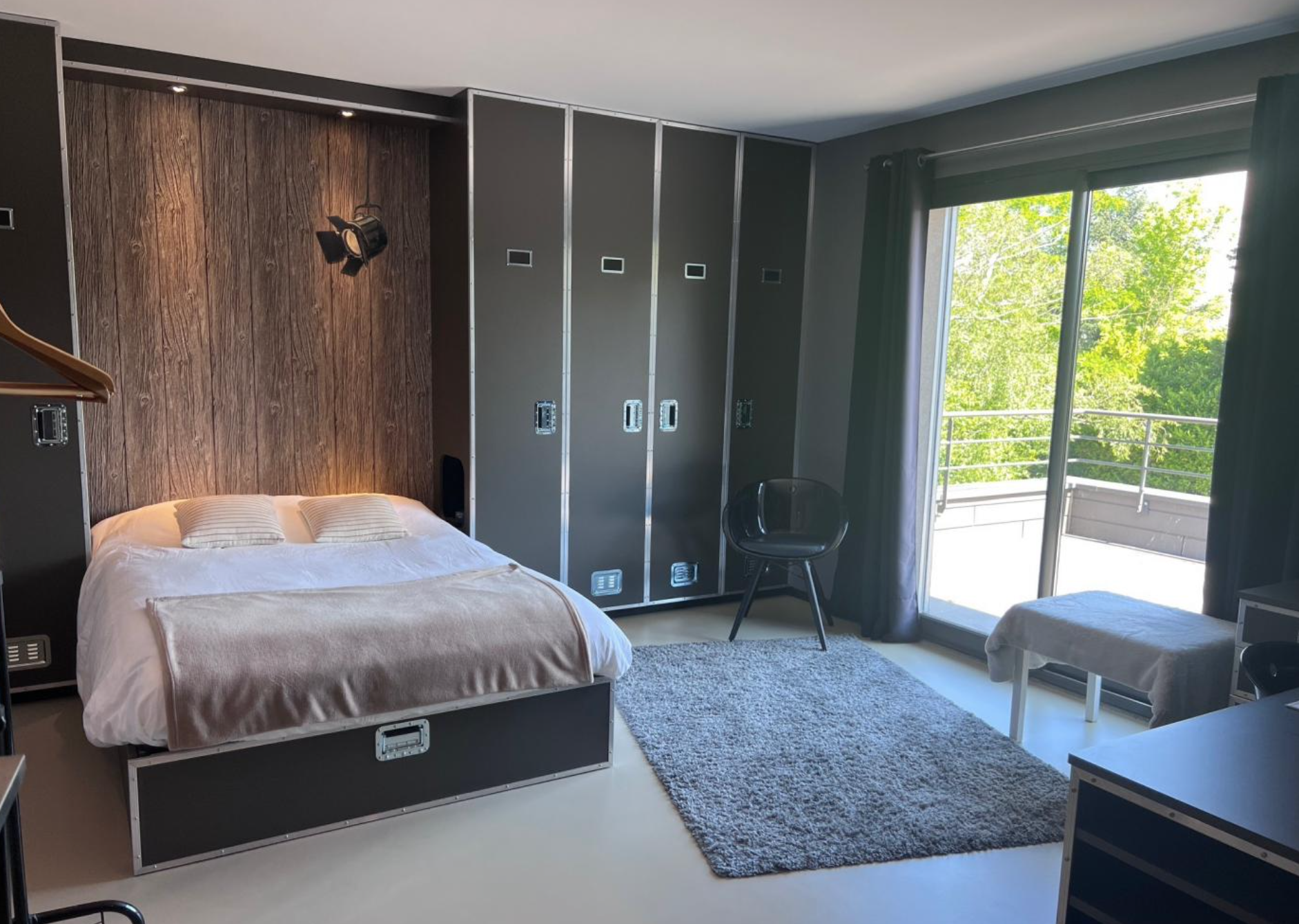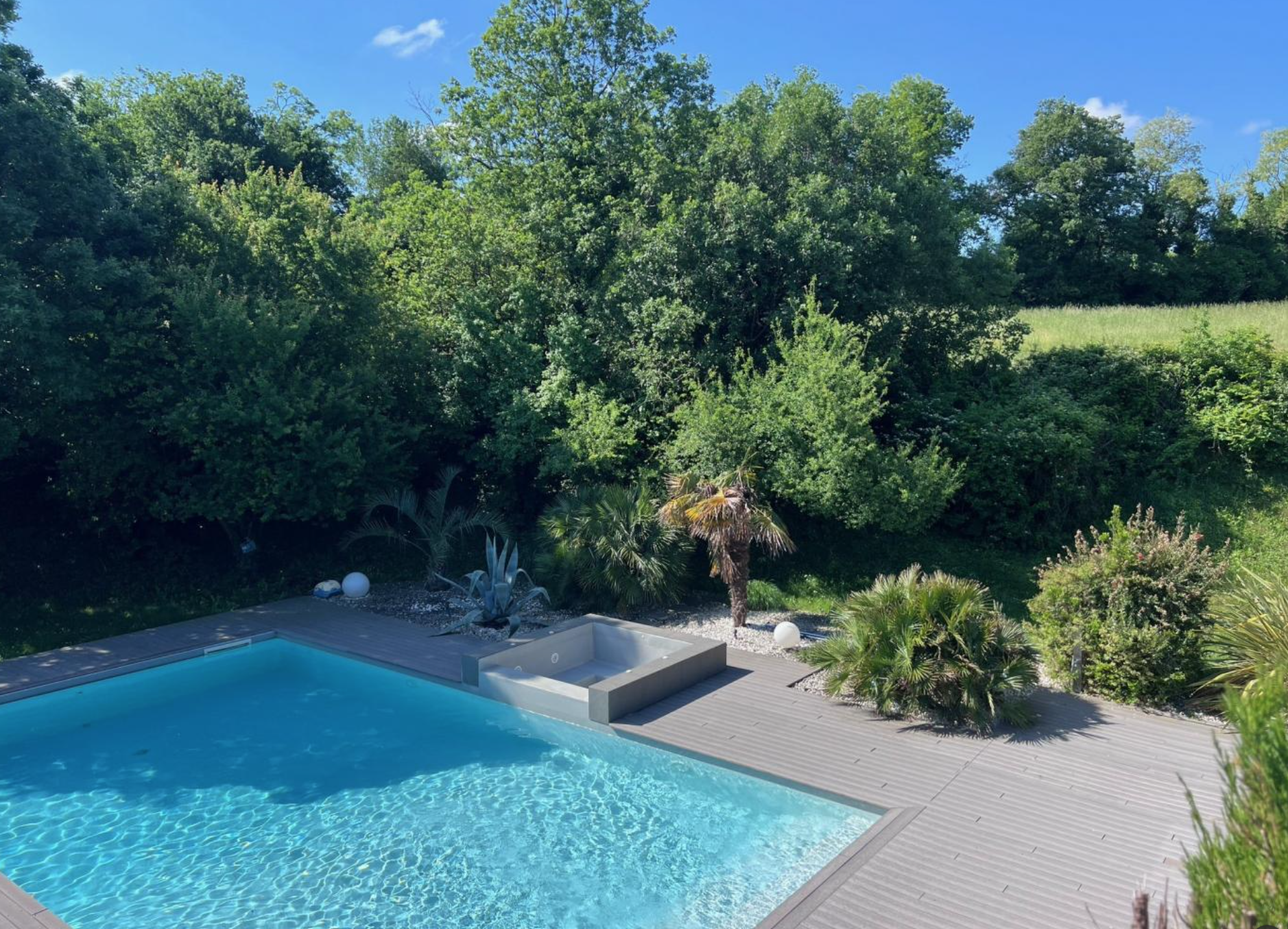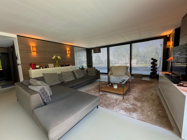 En intérieur grand volume de l'espace living avec sol en béton, cheminée, escalier design en acier et domotique. En extérieur piscine, terrasse et jardin soignée.